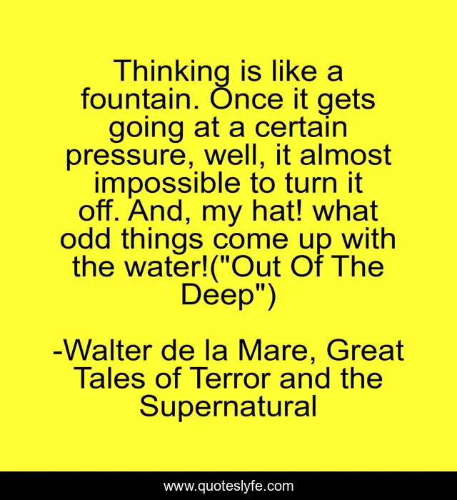 This page presents the quote "Thinking is like a fountain. Once it gets going at a certain pressure, well, it almost impossible to turn it off. And, my hat! what odd things come up with the water!("Out Of The Deep")". Author of this quote is Walter de la Mare, Great Tales of Terror and the Supernatural. This quote is about thinking, unconscious,.