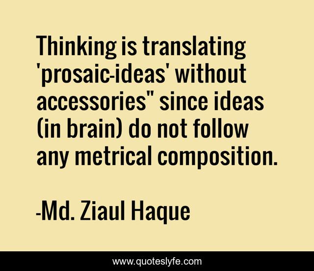 This page presents the quote "Thinking is translating 'prosaic-ideas' without accessories" since ideas (in brain) do not follow any metrical composition.". Author of this quote is Md. Ziaul Haque. This quote is about brain, translation, creativity, ideas,.
