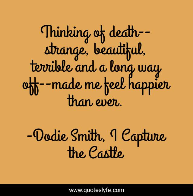 This page presents the quote "Thinking of death--strange, beautiful, terrible and a long way off--made me feel happier than ever.". Author of this quote is Dodie Smith, I Capture the Castle. .