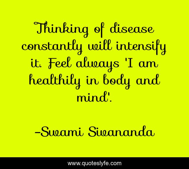 This page presents the quote "Thinking of disease constantly will intensify it. Feel always 'I am healthily in body and mind'.". Author of this quote is Swami Sivananda. This quote is about thinking, mind,.