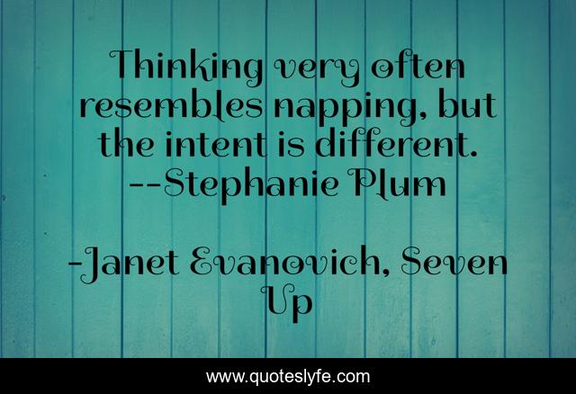 This page presents the quote "Thinking very often resembles napping, but the intent is different. --Stephanie Plum". Author of this quote is Janet Evanovich, Seven Up. This quote is about thinking, napping, stephanie-plum, sleeping, evanovich, intent, plum,.
