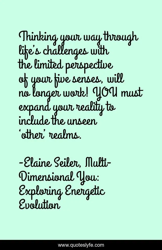 This page presents the quote "Thinking your way through life’s challenges with the limited perspective of your five senses, will no longer work! YOU must expand your reality to include the unseen ‘other’ realms.". Author of this quote is Elaine Seiler, Multi-Dimensional You: Exploring Energetic Evolution. This quote is about evolution, other-realms, beyond-five-senses, intuition, transformation-energetics, elaine-seiler,.