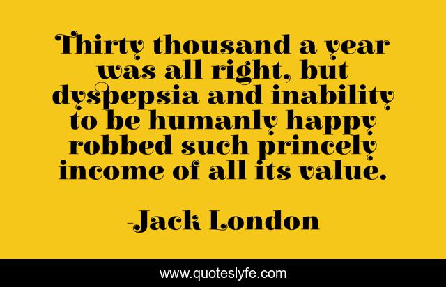 This page presents the quote "Thirty thousand a year was all right, but dyspepsia and inability to be humanly happy robbed such princely income of all its value.". Author of this quote is Jack London. This quote is about work, wealth, labor,.