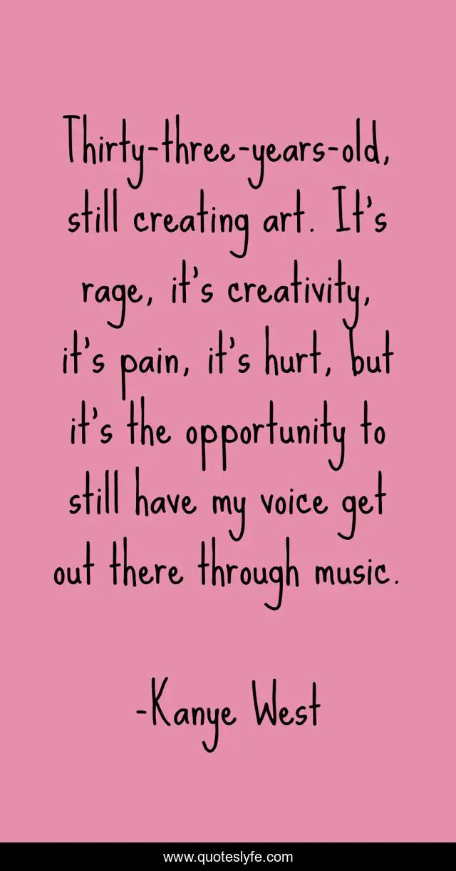This page presents the quote "Thirty-three-years-old, still creating art. It's rage, it's creativity, it's pain, it's hurt, but it's the opportunity to still have my voice get out there through music.". Author of this quote is Kanye West. This quote is about art, creativity, opportunity,.