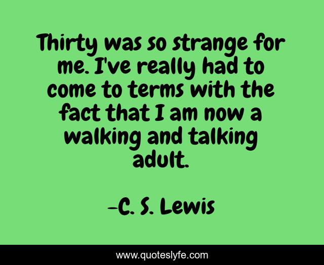This page presents the quote "Thirty was so strange for me. I've really had to come to terms with the fact that I am now a walking and talking adult.". Author of this quote is C. S. Lewis. This quote is about me, walking,.