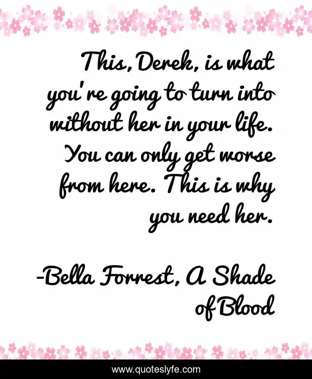 This page presents the quote "This, Derek, is what you’re going to turn into without her in your life. You can only get worse from here. This is why you need her.". Author of this quote is Bella Forrest, A Shade of Blood. This quote is about vampire-romance, young-adult-romance, vampires, paranormal-romance,.