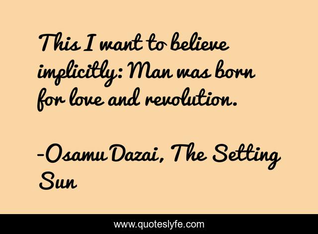 This page presents the quote "This I want to believe implicitly: Man was born for love and revolution.". Author of this quote is Osamu Dazai, The Setting Sun. This quote is about revolution, love, affection,.