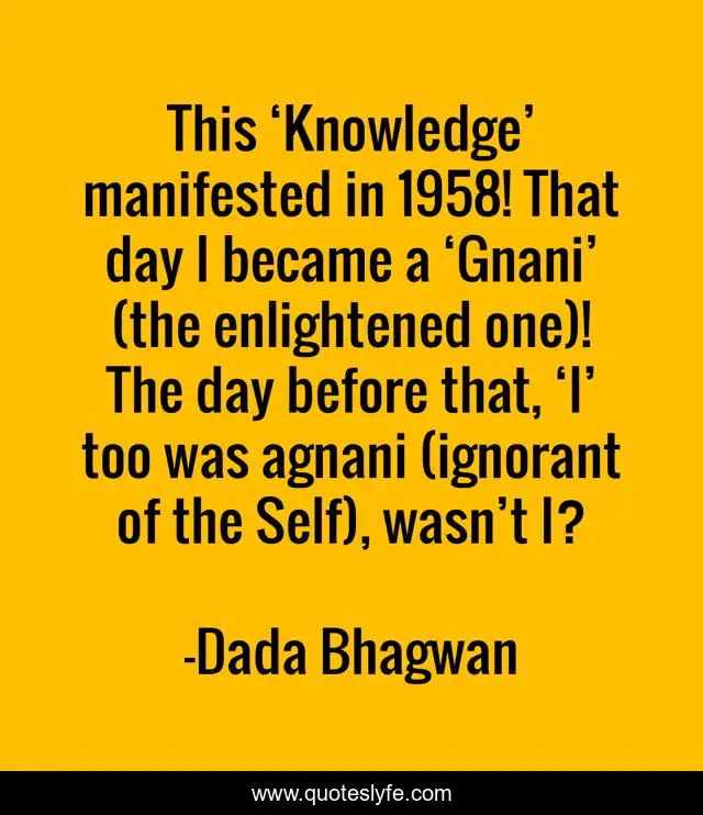 This page presents the quote "This ‘Knowledge’ manifested in 1958! That day I became a ‘Gnani’ (the enlightened one)! The day before that, ‘I’ too was agnani (ignorant of the Self), wasn’t I?". Author of this quote is Dada Bhagwan. This quote is about enlightened, gnan, spiritual, knowledge,.
