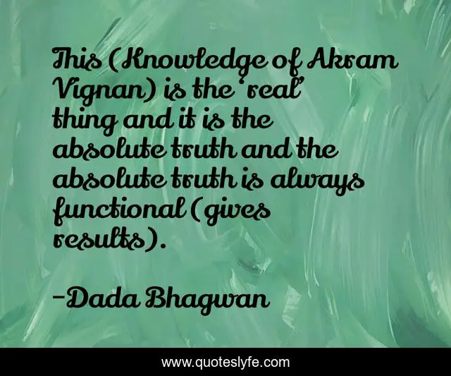 This page presents the quote "This (Knowledge of Akram Vignan) is the ‘real’ thing and it is the absolute truth and the absolute truth is always functional (gives results).". Author of this quote is Dada Bhagwan. This quote is about akram-vignan, spiritual, absolute-truth, truth, knowledge,.