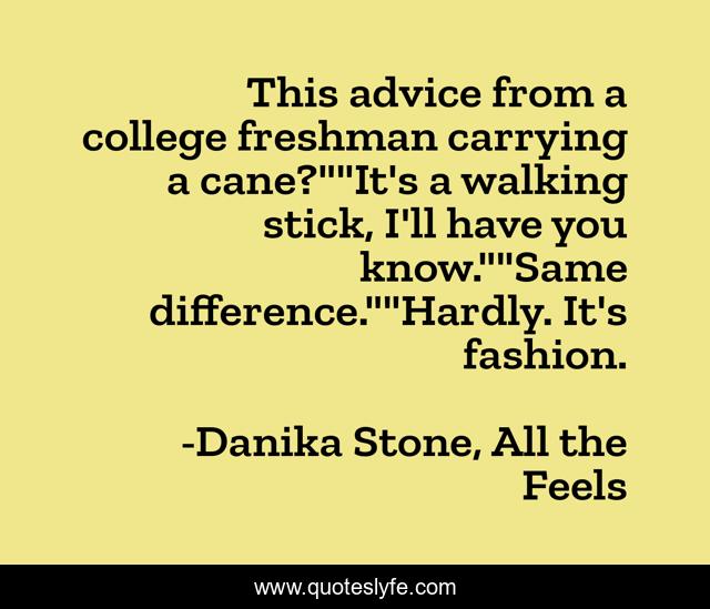 This page presents the quote "This advice from a college freshman carrying a cane?""It's a walking stick, I'll have you know.""Same difference.""Hardly. It's fashion.". Author of this quote is Danika Stone, All the Feels. This quote is about funny, canes, humor, walki-sticks, xander, liv, fashion, comedy, all-the-feels,.