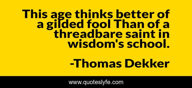 This page presents the quote "This age thinks better of a gilded fool Than of a threadbare saint in wisdom's school.". Author of this quote is Thomas Dekker. This quote is about fool, school, wisdom,.