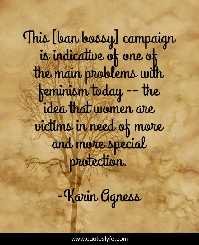This page presents the quote "This [ban bossy] campaign is indicative of one of the main problems with feminism today -- the idea that women are victims in need of more and more special protection.". Author of this quote is Karin Agness. This quote is about anti-feminism, feminism, victim-mentality, liberalism, bossy,.