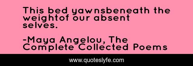 "Maya Angelou, The Complete Collected Poems Quotes." Quoteslyfe.com, 2025. Mon. 08 Dec. 2025. <https://www.quoteslyfe.com/quote/This-bed-yawnsbeneath-the-weightof-our-absent-139235>.