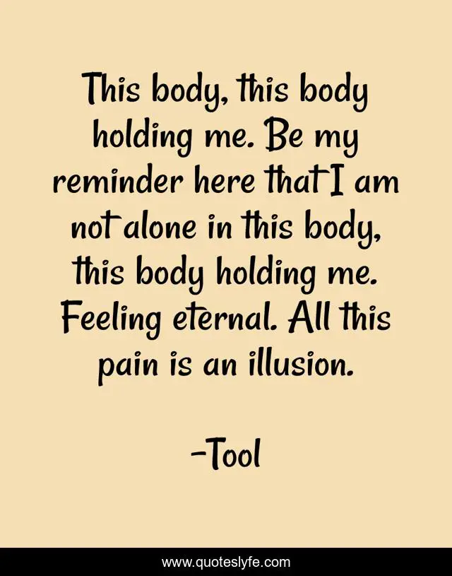 This page presents the quote "This body, this body holding me. Be my reminder here that I am not alone in this body, this body holding me. Feeling eternal. All this pain is an illusion.". Author of this quote is Tool. .