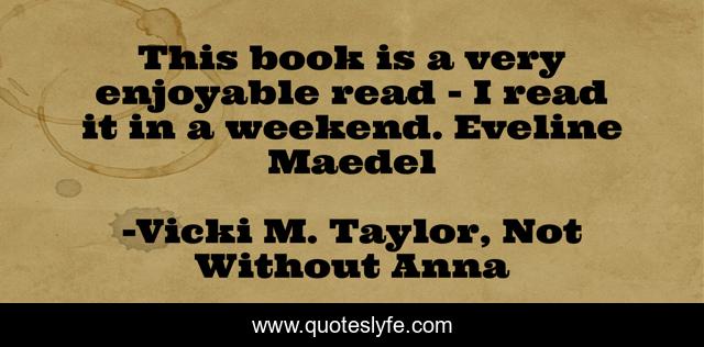 This page presents the quote "This book is a very enjoyable read - I read it in a weekend. Eveline Maedel". Author of this quote is Vicki M. Taylor, Not Without Anna. This quote is about enjoyable, book, mystery-suspense, not-without-anna,.