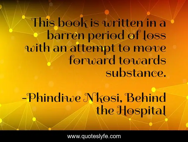 This page presents the quote "This book is written in a barren period of loss with an attempt to move forward towards substance.". Author of this quote is Phindiwe Nkosi, Behind the Hospital. This quote is about loss, pain, best-sellers, nothingness, barren, best-seller, nothing, fear, hope,.