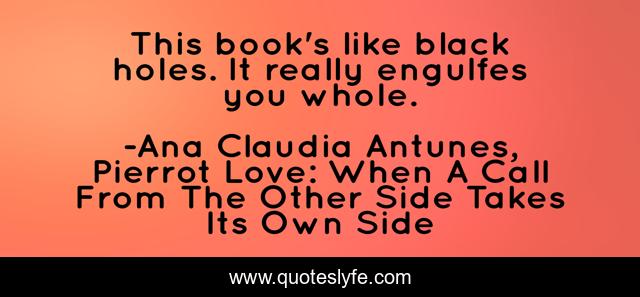 This page presents the quote "This book's like black holes. It really engulfes you whole.". Author of this quote is Ana Claudia Antunes, Pierrot Love: When A Call From The Other Side Takes Its Own Side. This quote is about ballet, love, black-holes, science, horror, creation, metaphysical, mystery-suspense, ghosts,.