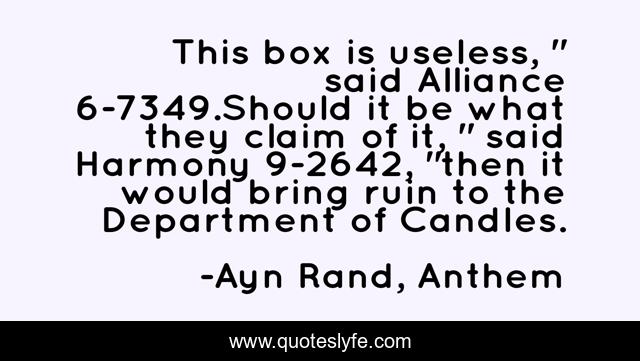 This page presents the quote "This box is useless, " said Alliance 6-7349.Should it be what they claim of it, " said Harmony 9-2642, "then it would bring ruin to the Department of Candles.". Author of this quote is Ayn Rand, Anthem. This quote is about falsehood, invention, conventionalism, ideas, change,.