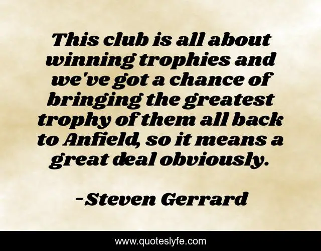 This page presents the quote "This club is all about winning trophies and we've got a chance of bringing the greatest trophy of them all back to Anfield, so it means a great deal obviously.". Author of this quote is Steven Gerrard. This quote is about great, greatest, winning,.
