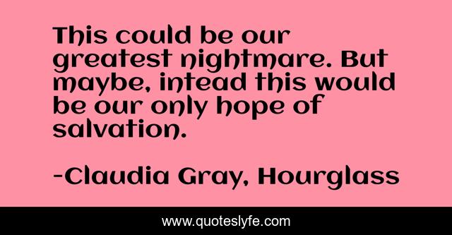 This page presents the quote "This could be our greatest nightmare. But maybe, intead this would be our only hope of salvation.". Author of this quote is Claudia Gray, Hourglass. This quote is about love, nightmare, salvation, affection, inmortality,.