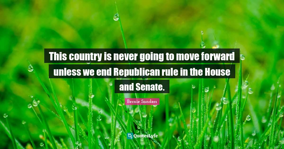 This page presents the quote "This country is never going to move forward unless we end Republican rule in the House and Senate.". Author of this quote is Bernie Sanders. This quote is about country, republican, house, senate, moving,.