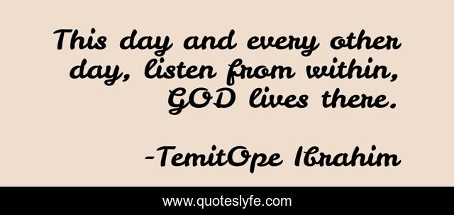 This page presents the quote "This day and every other day, listen from within, GOD lives there.". Author of this quote is TemitOpe Ibrahim. This quote is about confidence, attention, god, motivational, truths, life-truths, optimistic, inspirational, positive,.