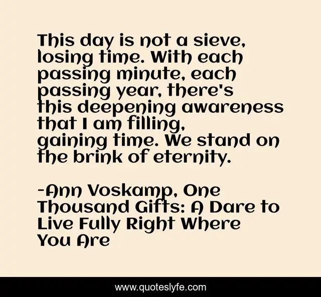 This page presents the quote "This day is not a sieve, losing time. With each passing minute, each passing year, there's this deepening awareness that I am filling, gaining time. We stand on the brink of eternity.". Author of this quote is Ann Voskamp, One Thousand Gifts: A Dare to Live Fully Right Where You Are. This quote is about eternity, faith,.