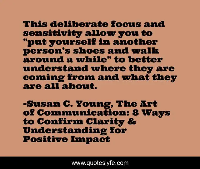This page presents the quote "This deliberate focus and sensitivity allow you to "put yourself in another person’s shoes and walk around a while" to better understand where they are coming from and what they are all about.". Author of this quote is Susan C. Young, The Art of Communication: 8 Ways to Confirm Clarity & Understanding for Positive Impact. This quote is about relationship, customer-service, communication-skills, mindfulness, positive-first-impression, quotes-by-susan-c-young, susanspeaks-com, motivational-speaker-susan-young, employee-engagement,.