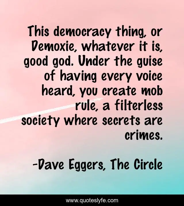 This page presents the quote "This democracy thing, or Demoxie, whatever it is, good god. Under the guise of having every voice heard, you create mob rule, a filterless society where secrets are crimes.". Author of this quote is Dave Eggers, The Circle. This quote is about democracy, secrets, crime, mob, thought-crime, participation,.