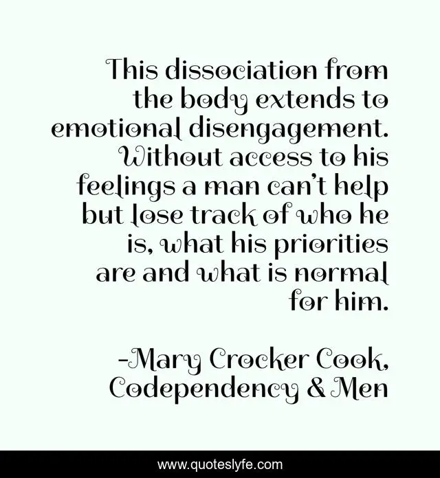 This page presents the quote "This dissociation from the body extends to emotional disengagement. Without access to his feelings a man can’t help but lose track of who he is, what his priorities are and what is normal for him.". Author of this quote is Mary Crocker Cook, Codependency & Men. This quote is about codependency, men, dissociation, priorities, emotional-disengagement,.