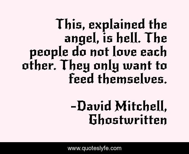 This page presents the quote "This, explained the angel, is hell. The people do not love each other. They only want to feed themselves.". Author of this quote is David Mitchell, Ghostwritten. This quote is about hell, love, affection,.