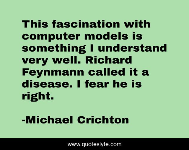 This page presents the quote "This fascination with computer models is something I understand very well. Richard Feynmann called it a disease. I fear he is right.". Author of this quote is Michael Crichton. This quote is about science, richard-feynmann, computer-models,.