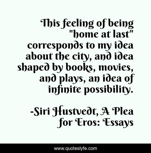 "Siri Hustvedt, A Plea for Eros: Essays Quotes." Quoteslyfe.com, 2025. Fri. 05 Dec. 2025. <https://www.quoteslyfe.com/quote/This-feeling-of-being-home-at-last-182532>.