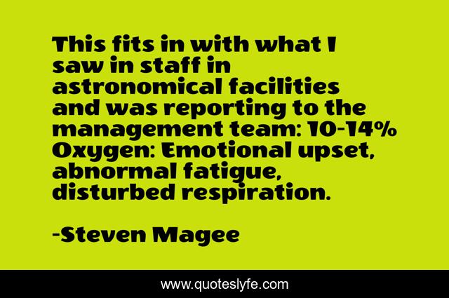 This page presents the quote "This fits in with what I saw in staff in astronomical facilities and was reporting to the management team: 10-14% Oxygen: Emotional upset, abnormal fatigue, disturbed respiration.". Author of this quote is Steven Magee. This quote is about management, respiration, oxygen, abnormal, astronomical, reporting, upset, astronomy, astrophysics,.