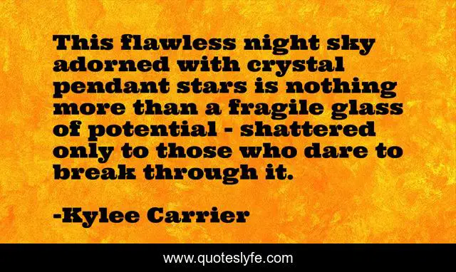 This page presents the quote "This flawless night sky adorned with crystal pendant stars is nothing more than a fragile glass of potential - shattered only to those who dare to break through it.". Author of this quote is Kylee Carrier. This quote is about life, inspirational, philosophy, understanding, goals, learning, growing, enthusiasm, achievment,.