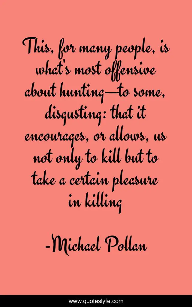 This page presents the quote "This, for many people, is what's most offensive about hunting—to some, disgusting: that it encourages, or allows, us not only to kill but to take a certain pleasure in killing". Author of this quote is Michael Pollan. This quote is about animals, animal-rights, animal, animal-cruelty,.
