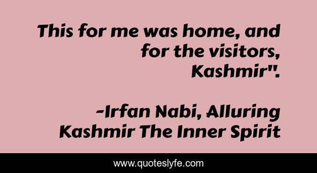 This page presents the quote "This for me was home, and for the visitors, Kashmir".". Author of this quote is Irfan Nabi, Alluring Kashmir The Inner Spirit. This quote is about culture, travel, kashmir, alluringkashmirtheinnerspirit,.