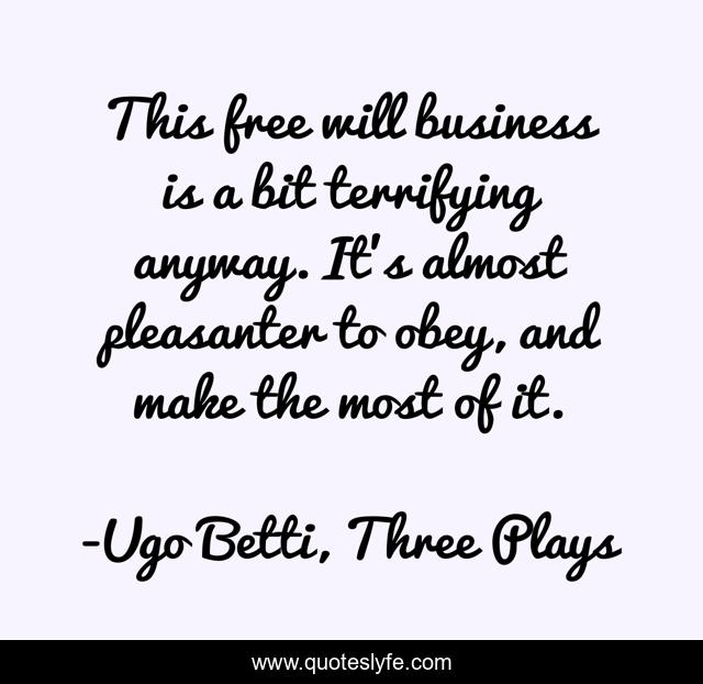 This page presents the quote "This free will business is a bit terrifying anyway. It's almost pleasanter to obey, and make the most of it.". Author of this quote is Ugo Betti, Three Plays. This quote is about obey, willow-madison, free-will-hell, free-will, obedience, ugo-betti,.