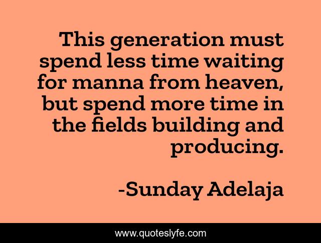 This page presents the quote "This generation must spend less time waiting for manna from heaven, but spend more time in the fields building and producing.". Author of this quote is Sunday Adelaja. This quote is about building, generation, heaven, produce,.