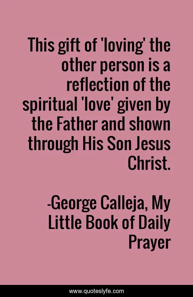 This page presents the quote "This gift of 'loving' the other person is a reflection of the spiritual 'love' given by the Father and shown through His Son Jesus Christ.". Author of this quote is George Calleja, My Little Book of Daily Prayer. .