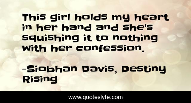 This page presents the quote "This girl holds my heart in her hand and she's squishing it to nothing with her confession.". Author of this quote is Siobhan Davis, Destiny Rising. This quote is about romance, ya, love, science-fiction, affection,.