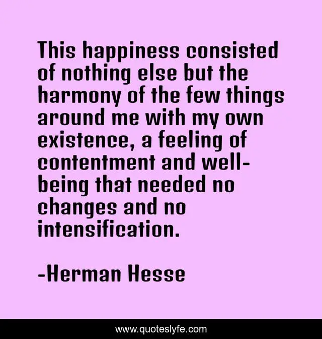 This page presents the quote "This happiness consisted of nothing else but the harmony of the few things around me with my own existence, a feeling of contentment and well-being that needed no changes and no intensification.". Author of this quote is Herman Hesse. This quote is about me, changes, well-being,.