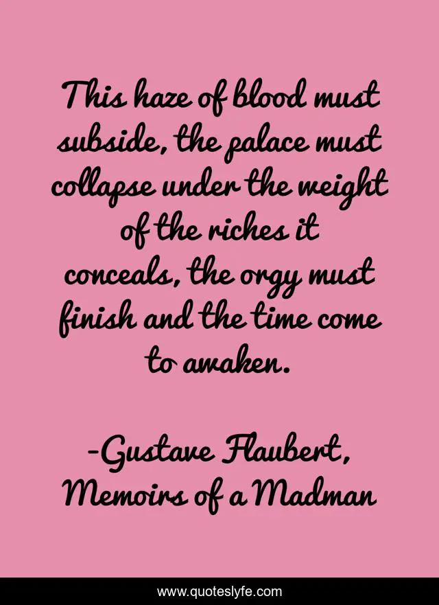 This page presents the quote "This haze of blood must subside, the palace must collapse under the weight of the riches it conceals, the orgy must finish and the time come to awaken.". Author of this quote is Gustave Flaubert, Memoirs of a Madman. This quote is about end, ending,.