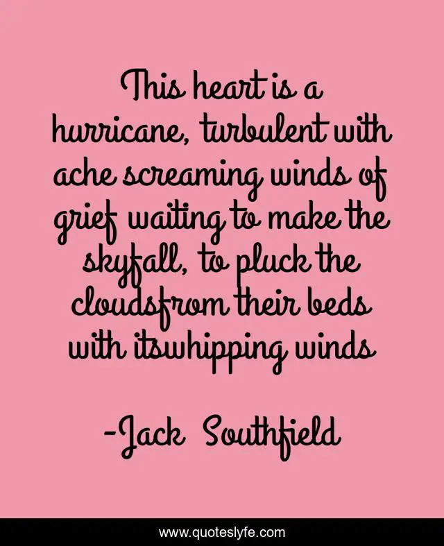 This page presents the quote "This heart is a hurricane, turbulent with ache screaming winds of grief waiting to make the skyfall, to pluck the cloudsfrom their beds with itswhipping winds". Author of this quote is Jack Southfield. This quote is about literature, love, grief, sadness, poems, affection,.