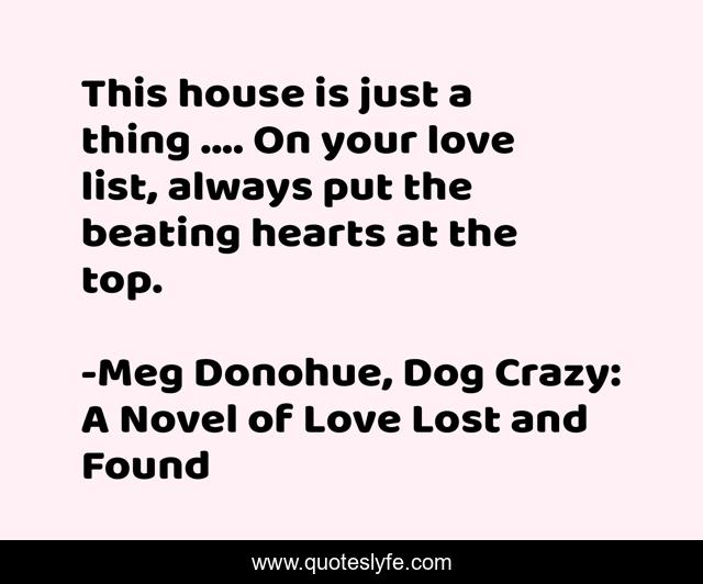 This page presents the quote "This house is just a thing .... On your love list, always put the beating hearts at the top.". Author of this quote is Meg Donohue, Dog Crazy: A Novel of Love Lost and Found. This quote is about life-philosophy, dogs, life-lessons, dogs-and-humans,.