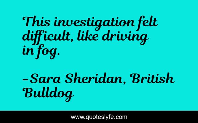 This page presents the quote "This investigation felt difficult, like driving in fog.". Author of this quote is Sara Sheridan, British Bulldog. This quote is about mystery, mirabelle-bevan, sara-sheridan, difficulty, fog, investigation,.