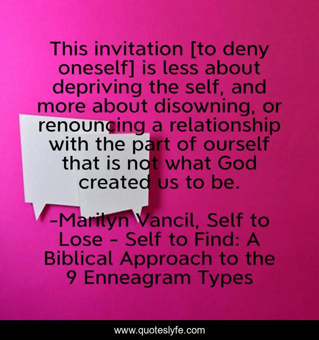 This page presents the quote "This invitation [to deny oneself] is less about depriving the self, and more about disowning, or renouncing a relationship with the part of ourself that is not what God created us to be.". Author of this quote is Marilyn Vancil, Self to Lose - Self to Find: A Biblical Approach to the 9 Enneagram Types. This quote is about enneagram, denying-self, abundant-life, christian-living, 9-types, christianity, personality,.