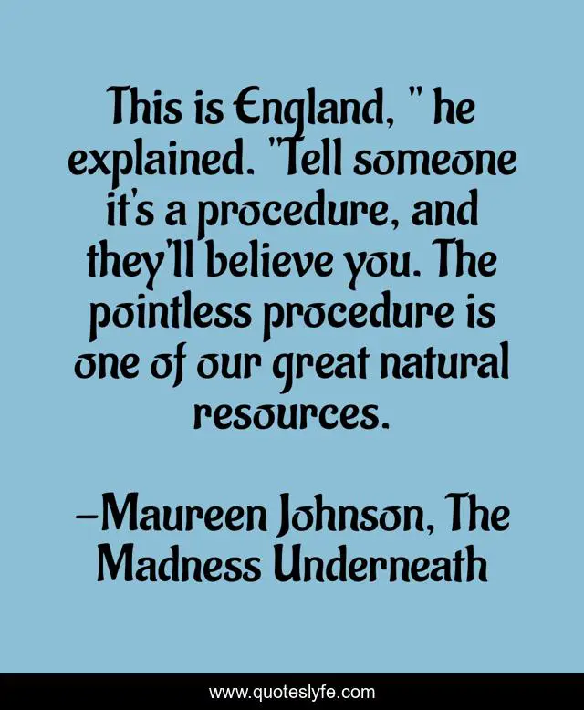 This page presents the quote "This is England, " he explained. "Tell someone it's a procedure, and they'll believe you. The pointless procedure is one of our great natural resources.". Author of this quote is Maureen Johnson, The Madness Underneath. This quote is about london, england, law, procedures,.