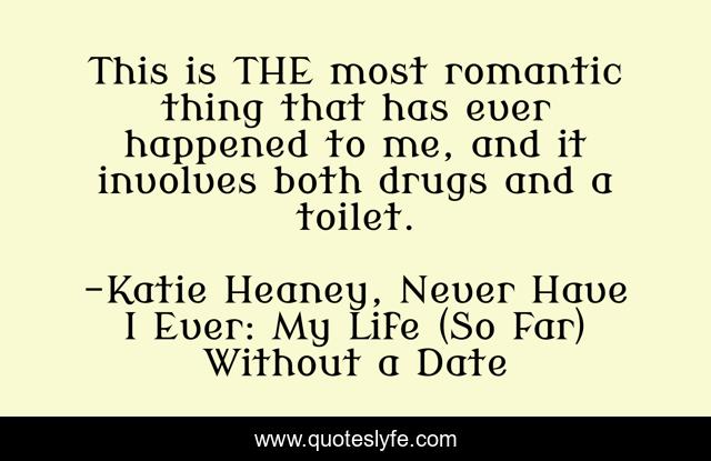This page presents the quote "This is THE most romantic thing that has ever happened to me, and it involves both drugs and a toilet.". Author of this quote is Katie Heaney, Never Have I Ever: My Life (So Far) Without a Date. This quote is about drugs, romance, romantic,.