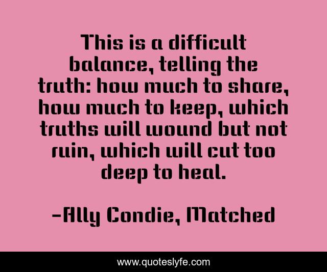This page presents the quote "This is a difficult balance, telling the truth: how much to share, how much to keep, which truths will wound but not ruin, which will cut too deep to heal.". Author of this quote is Ally Condie, Matched. This quote is about integerity, honesty,.